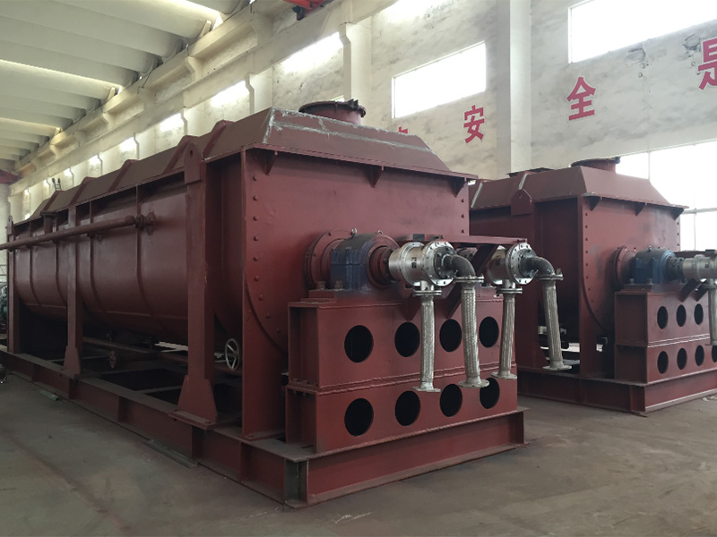 空心轴上密集排列着楔型中空浆叶,热介质经空心轴流经浆叶。单位有效容积内传热面积很大,热介质温度从-40℃到320℃,可以是水蒸汽,也可以是液体型:如热水、导热油等。间接传导加热,没有携带空气带走热量,热量均用来加热物料。热量损失仅为通过器体保温层向环境的散热。楔型浆叶传热面具有自清洁功能。物料颗粒与楔型面的相对运动产生洗刷作用,能够洗刷掉楔型面上附着物料,使运转中一直保持着清洁的传热面。浆叶干燥机的壳体为Ω型,壳体内一般安排二到四根空心搅拌轴。壳体有密封端盖与上盖,防止物料粉尘外泄而充分发挥作用。