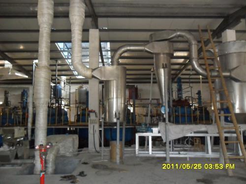 底部强化器设计独特,搅拌齿为菱形,其流线性能使风阻达到小,设置在圆锥形料斗内,分动刀和定刀,粉碎效果显著,使下落的结块物料迅速粉碎为适合气流干燥的粉粒料,搅拌的另一个主要作用是分散物料,加大了与料斗下面进来的高速热风的接触面积,于是料斗区形成了一个强烈传热传质的流化床,大部分湿分在料斗区被干燥。随着干燥的进行,变轻变细的干料受气流作用明显,与气流一起上升并进一步干燥,后从干燥塔顶部出来进入物料收集系统。
